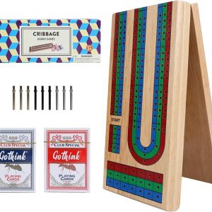 Wooden Folding Cribbage Board Game Set – Portable Travel Board with 3 Tracks, Large Storage, 9 Metal Pegs & 2 Cards – Classic Table Game for Adults, Kids & Family Nigh